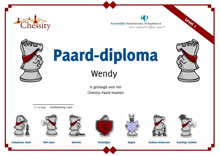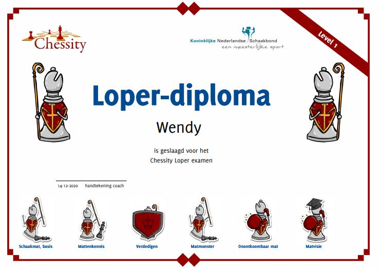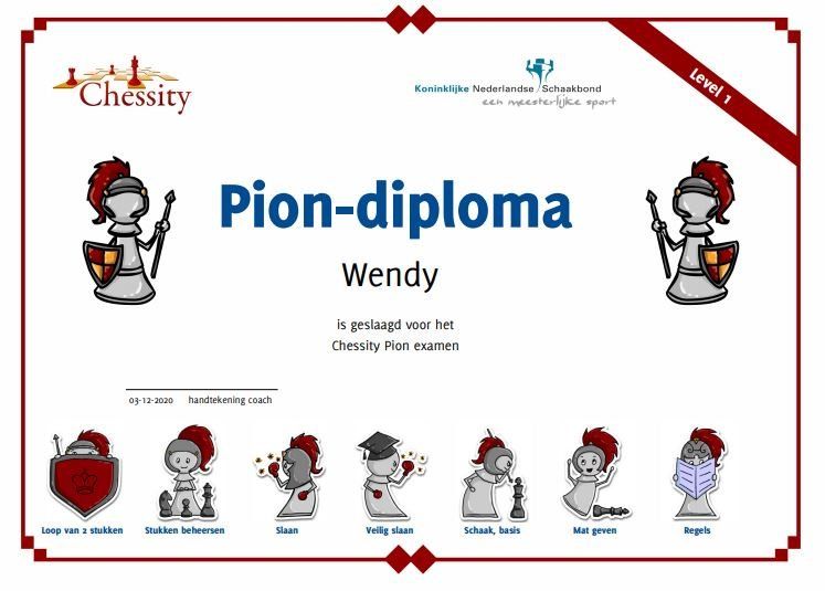 Toen ik de site vond dacht ik dat het leuk was voor de kinderen. We konden ons inschrijven en het een maand gratis proberen. Het is de ideale site voor kinderen om spelenderwijs op een gamende manier te leren schaken. Ze zeggen dat je binnen 21 dagen een Pion diploma kunt halen. Nou was ik erg enthousiast en heb in 3 dagen mijn Pion diploma gehaald. De week erna ben ik doorgegaan met oefenen voor het Paard diploma, om daarna meteen door te gaan voor het Loper diploma. Ik heb daarna een maandabonnement afgesloten en het leek me allemaal heel voorspoedig te gaan totdat ik bij het Toren diploma kwam, daar liep ik vast en ben ook niet meer verder gekomen. Ook kwam ik er later pas achter dat je ook de versie zonder spelletjes kon doen en die meteen wat dieper op de stof in gaat.